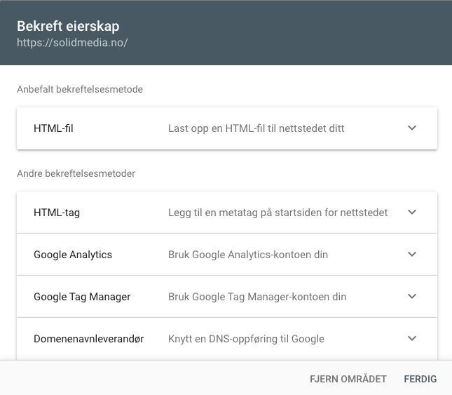 For nettadresseprefiks: Legg inn en kodesnutt i HTML-koden via CMS-et. Du kan også bruke tilgangen din i Google Tag Manager eller Google Analytics til å få godkjent verifisering. Denne passer bedre om du ikke har tilgang til webhotell og server.