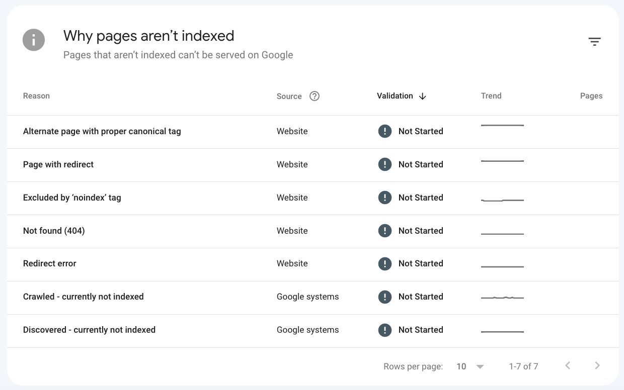 Nedenfor grafen finner du en indekseringsoversikt for hvordan Google indekserer innholdet. Denne inneholder flere ulike grunner til hvorfor sider på nettsiden ikke blir indeksert.