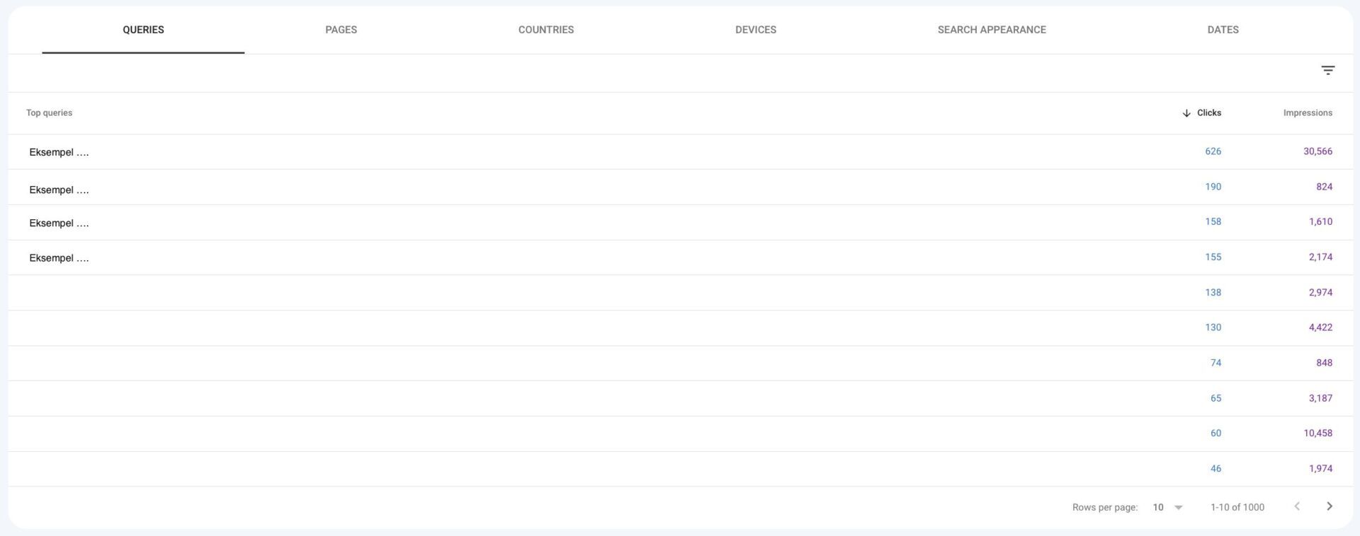 Om du går til seksjonen nedenfor grafen kan du se en oversikt over topp 10 søkeord og sider for nettsiden, basert på klikk og visninger.