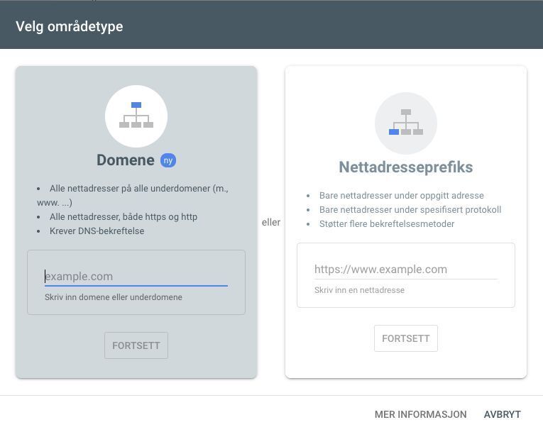 Velg hvordan du vil verifisere nettstedet ditt, enten med “domeneverifisering” eller “nettadresseprefiks”. Hovedforskjellen på disse to er at med “domeneverifisering” får du tilgang til alle URL-variasjoner og subdomener, mens “nettadresseprefiks” gir deg kun tilgang til den ene variasjonen.