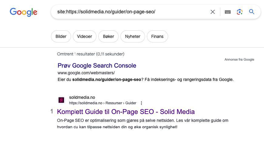 Gjør et Google-søk der du skriver “site:(den URL-en du skal sjekke)”. For eksempel: site:https://www.solidmedia.no/seo/hva-er-on-page-seo